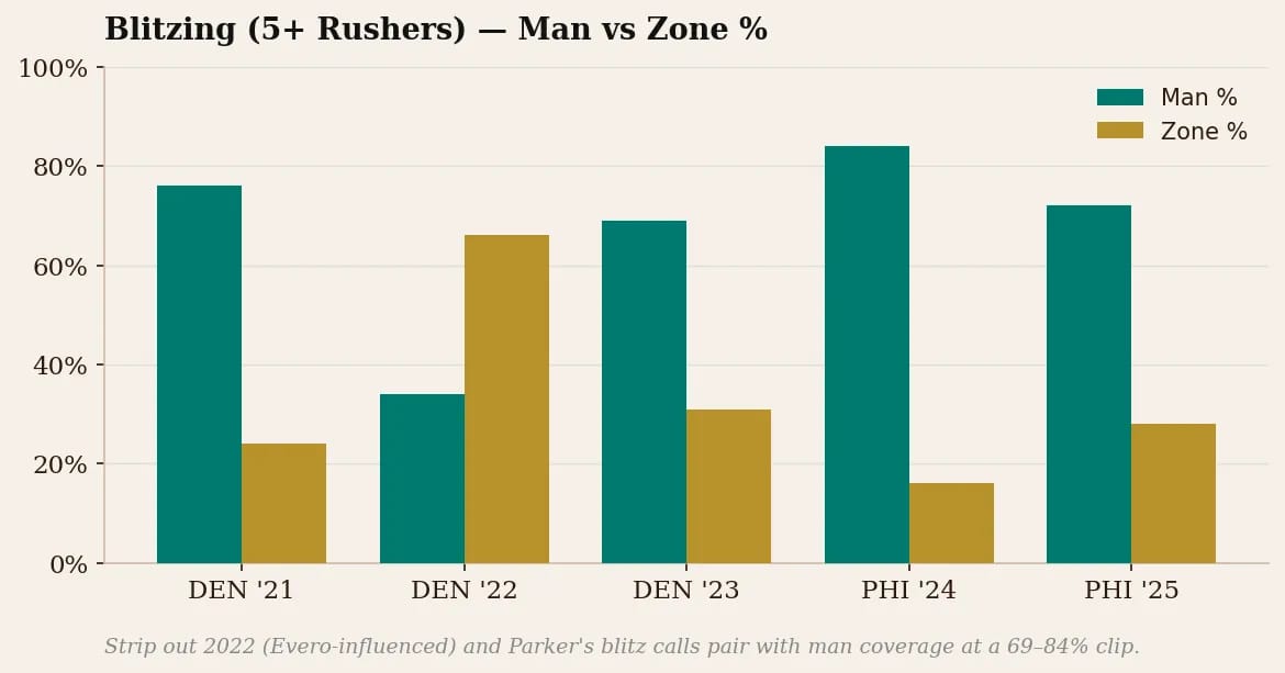 And here’s what makes that important. If you take away the Evero-influenced 2022 season, Parker’s blitz calls pair with man coverage at a 69 to 84% clip. So his pressure package isn’t designed around zone drops that leave soft spots for hot routes. It’s designed around corners who can win one-on-one. That distinction matters more than anything else in understanding what he’s building in Dalla