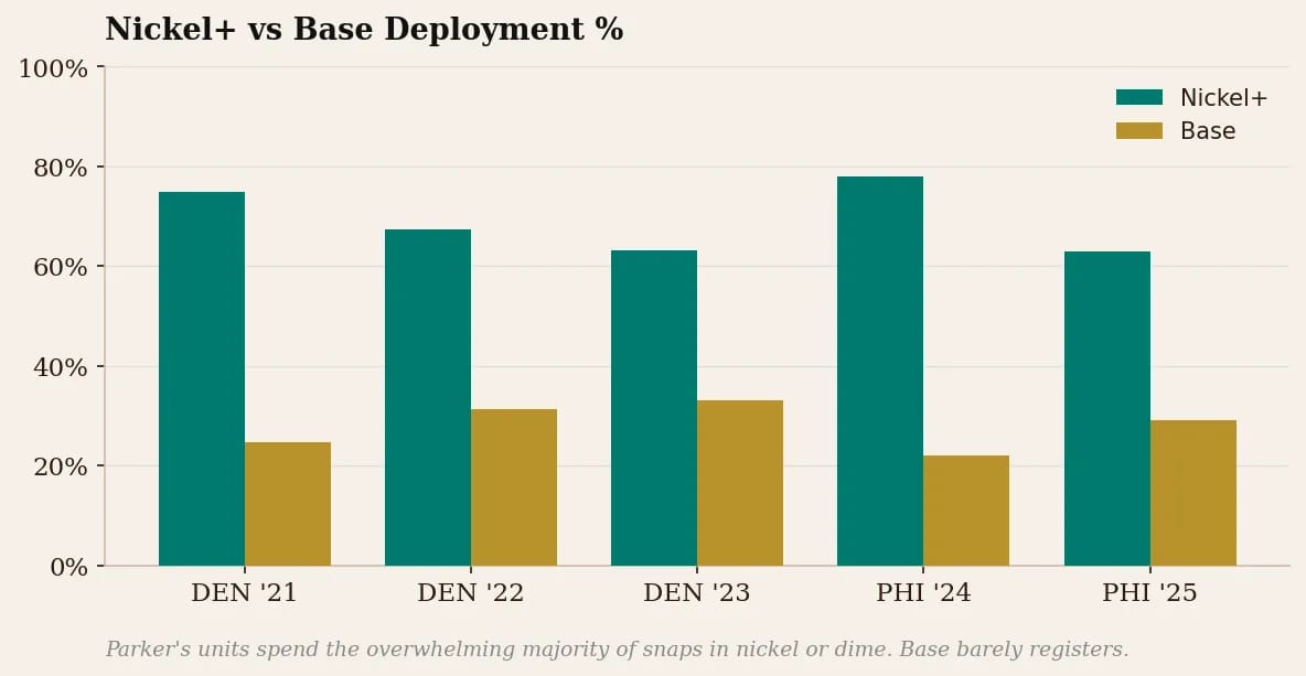 Parker’s defenses live in nickel. Across five seasons, his units have played with five or more defensive backs on 63 to 78% of snaps. The base 4-3 or 3-4 defense is essentially extinct in his system.
