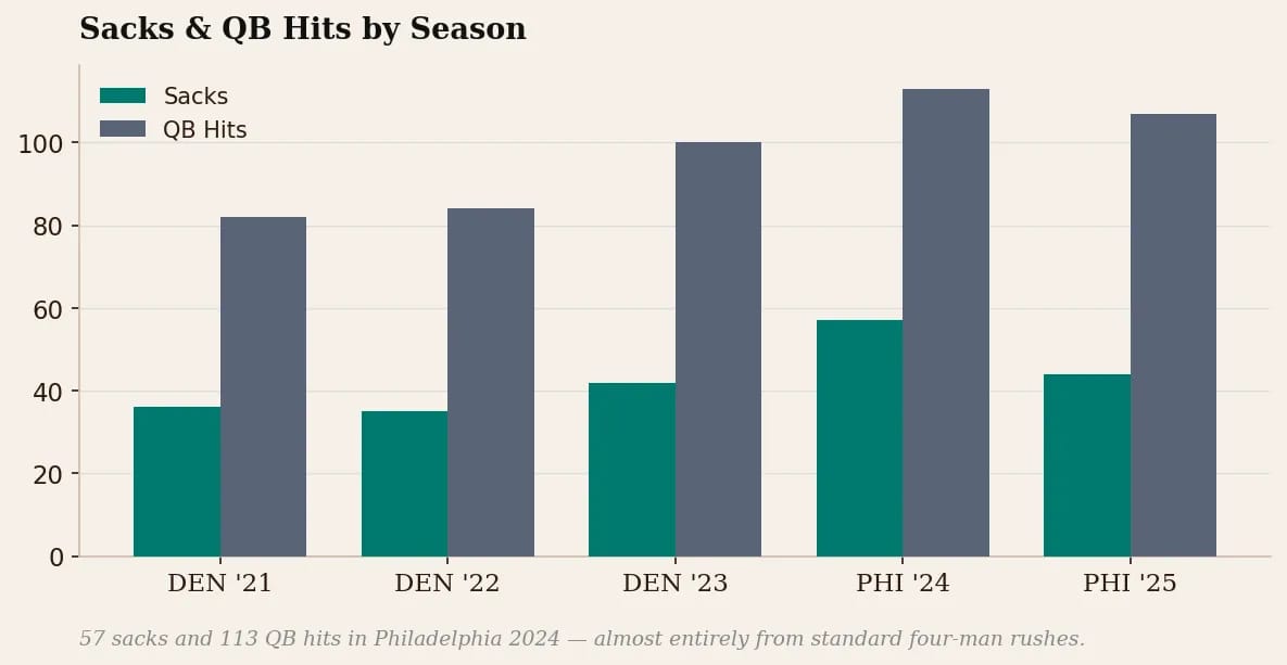 The blitz rate across his defenses has been remarkably stable, 12.7 to 15.2%, well below the NFL average of 27%. But look at what happened when he moved to Philadelphia with Jalen Carter, Josh Sweat, and Nolan Smith. 57 sacks and 113 QB hits in 2024, almost entirely from the standard defensive line. Not from blitzing.