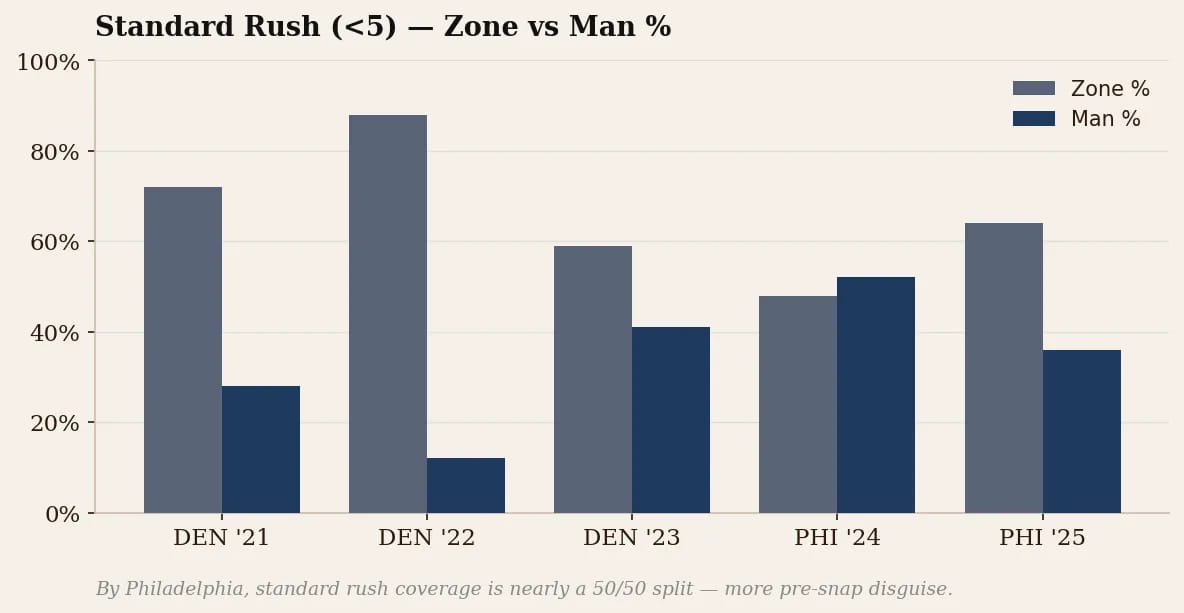 Cover 1 is his base coverage. In four of five seasons it’s been the most-called shell, and it peaked at 42.7% in Philadelphia’s 2024 season. In his early Denver years, he leaned on Cover 6, a quarter-field split coverage hybrid, but by 2023 that was almost fully phased out, replaced by a cleaner toggle between Cover 1 and Cover 3, especially once Parker gained more influence over the scheme.