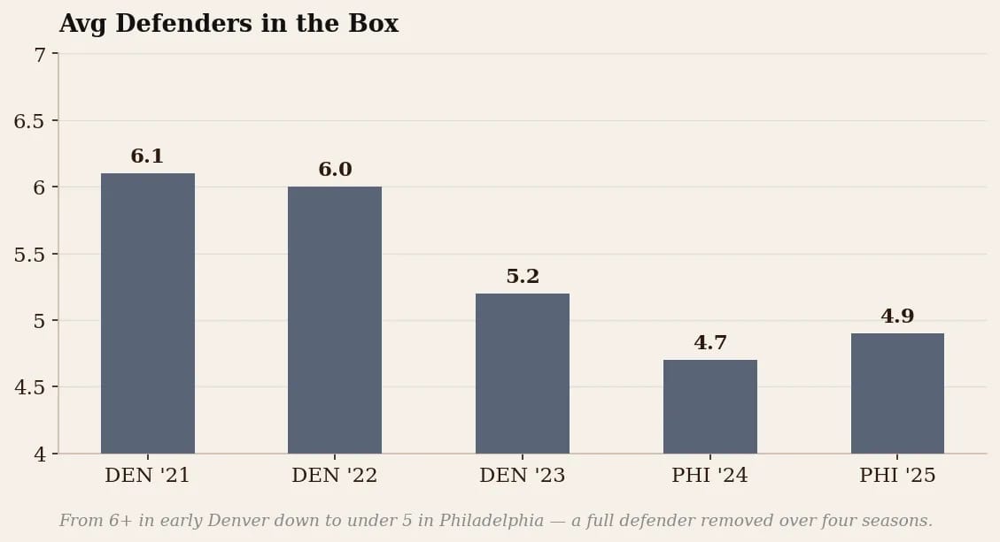 What that means in practice is a defense going from about six defenders in the box on average in early Denver all the way down to under five in Philadelphia. The shift across those three Denver seasons, losing a full man from the box, is really the clearest signal of Parker moving the scheme toward more single-high looks. This defense is built to defend the pass first, and use big, physical defensive tackles to stuff and pursue the run when it comes.